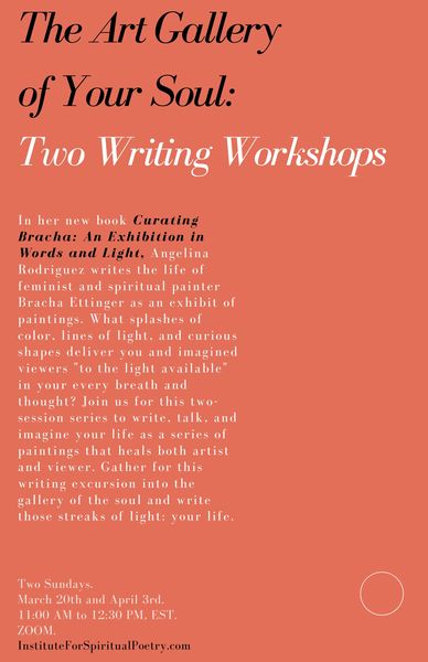 In her new book Curating Bracha: An Exhibition in Words and Light, Angelina Rodriguez writes the life of feminist and spiritual painter Bracha Ettinger as an exhibit of paintings. What splashes of color, lines of light, and curious shapes deliver you and imagined viewers "to the light available" in your every breath and thought? Join us for this two-session series to write, talk, and imagine your life as a series of paintings that heals both artist and viewer. Gather for this writing excursion into the gallery of the soul and write those streaks of light: your life.